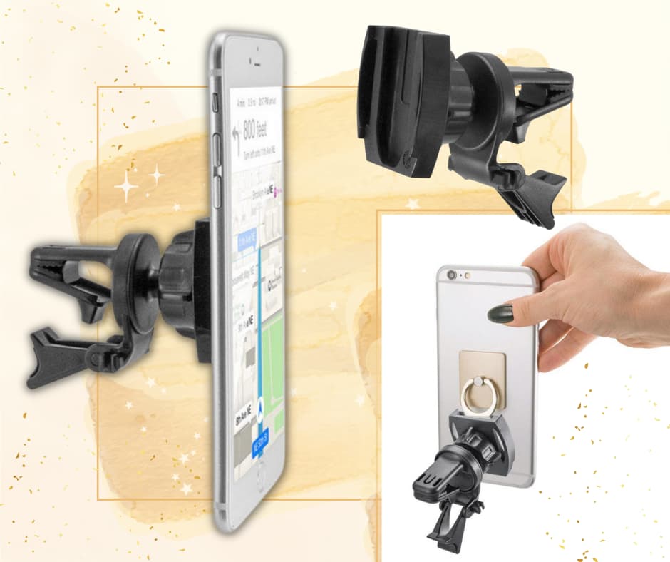 Sätt en ring på det med Arkon FNGRING157 bilhållare till ventilationsgallret som kommer med en vacker ringhållare som fungerar på två sätt. Ringhållaren fästs på baksidan av din mobil och hjälper dig att minimera risken att du tappar mobilen i marken.