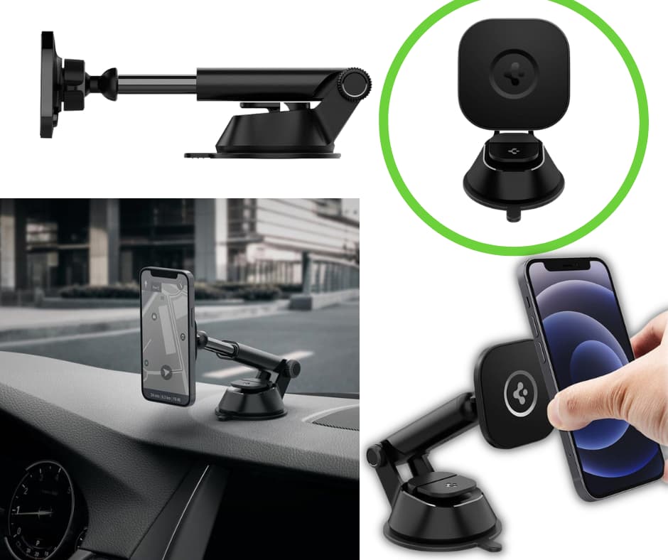 Spigen ITS35 magnetisk hållare till instrumentbrädan fungerar bra med din iPhone 12 genom att ge ett stabilt och bra grepp om enheten. Hållaren är designad med en monteringsarm som är fullt justerbar och extremt behändig.