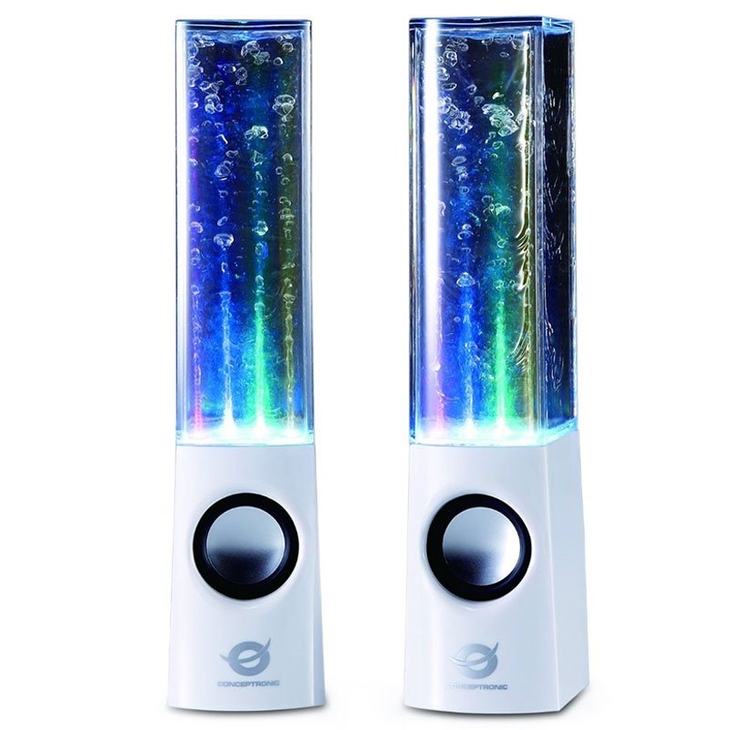 Conceptronic Dancing Water högtalare är ett par stiliga högtalare med 4-färgers LED- ljus. Dess moderna och kompakta design kommer att se fantastisk ut i dina olika interiörer. Den kommer även att erbjuda dig en fantastisk befriande upplevelse med dess dansande vattenshow av fontänljus. Vattenstrålarna kommer att studsa i musikrytmen som du spelar på din dator, laptop eller MP3-spelare samt avge ett svagt vattenljud. Du behöver inget vägguttag eftersom högtalaren strömförsörjs via USB-utgång. Nackdelen är att det inte går att justera ljudstyrkan direkt via högtalarsetet utan endast via dina enheter.