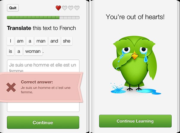Varje nivå innehåller ett visst antal hjärtan, som du förlorar om du svarar fel. När du förlorar alla hjärtan, måste du börja lektionen igen. Du kan också få hjälp om du är osäker på ett visst ord – klicka på ordet för att förklara.
