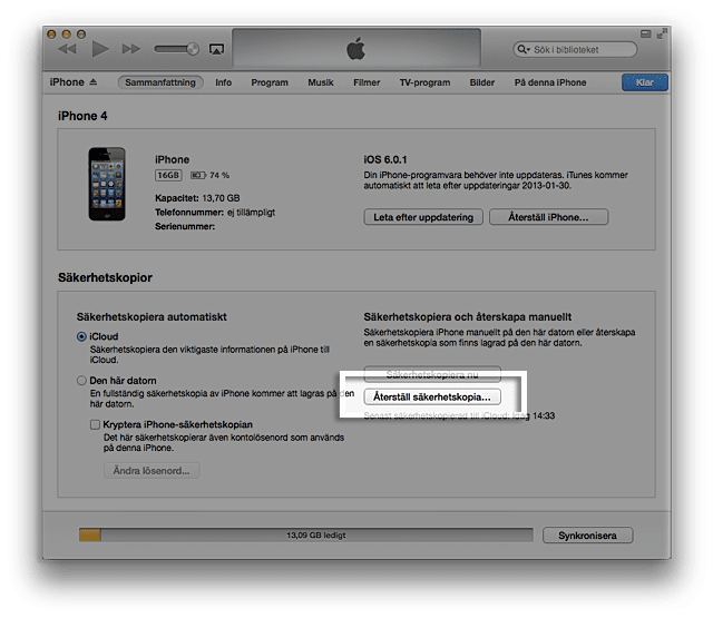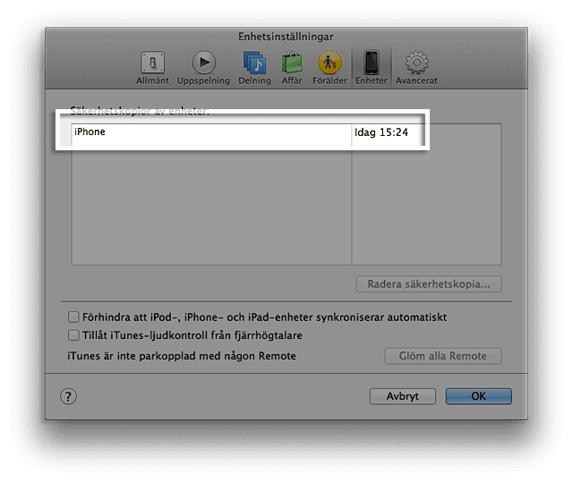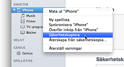 Du kan synkronisera din enhet med iTunes så här: Under Enheter i iTunes kan du högerklicka på iOS-enheten (iPhone) och sedan välja Säkerhetskopiera