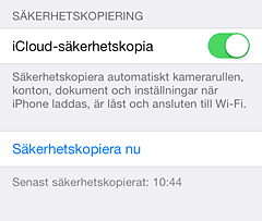 Du kan också starta säkerhetskopiering manuellt: Inställningar > iCloud > Lagring, Säkerhetskopiering och sedan välja Säkerhetskopiera nu.