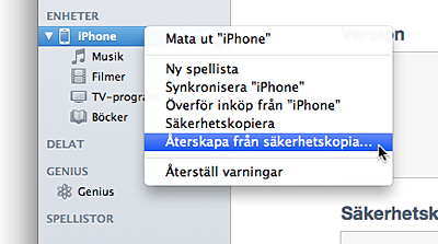Klicka på Enheter-menyn, högerklicka på din enhet (iPhone) och välj Återskapa från säkerhetskopia