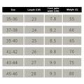 Storlek 37-38: Längd: 24 cm, Framfotsbredd: 8,2 cm, Vikt: 60 g