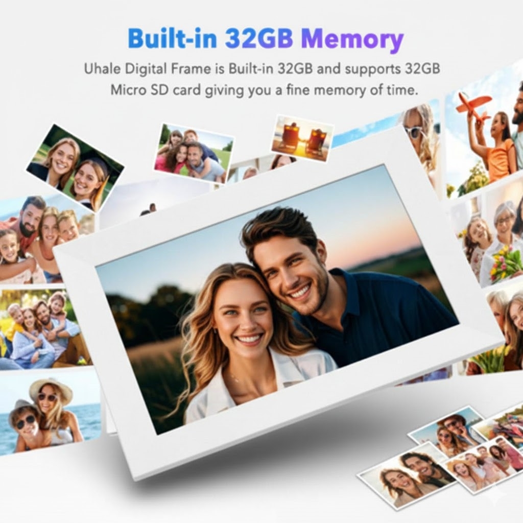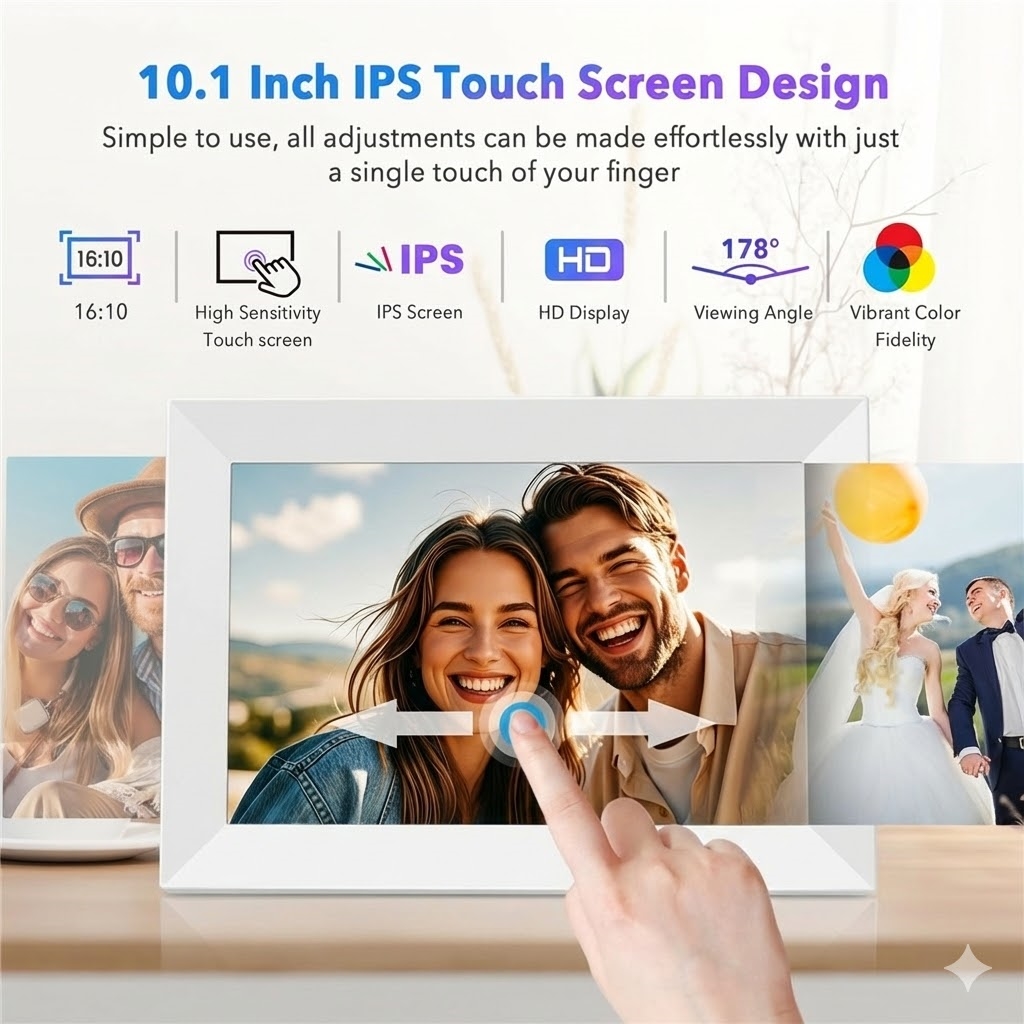 Denna 10.1" WiFi Digital Photo Frame ger skarp bildkvalitet, smart trådlös delning, generös lagring och anslutning för flera användare, vilket gör den till den perfekta moderna lösningen för familjer, kontor eller som en omtänksam present.