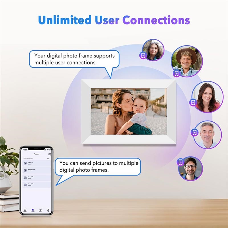 Med hjälp av den medföljande mobilappen kan du direkt skicka foton eller videor till ramen var du än befinner dig. Stöd för synkronisering av flera enheter gör att flera familjemedlemmar kan dela ögonblick direkt till ramen.