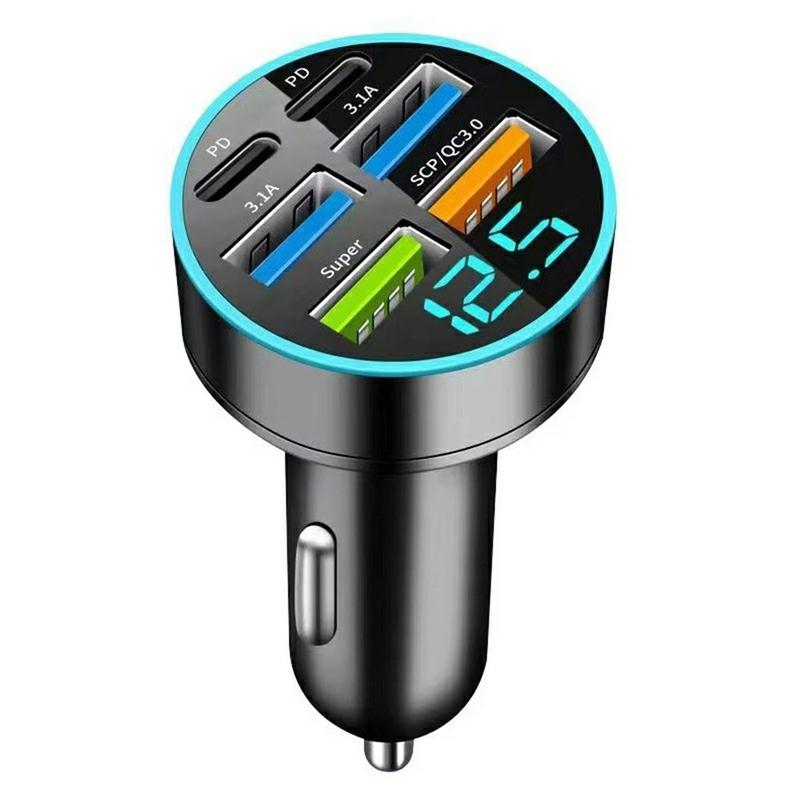 100W 6-portars billaddare - PD & QC3.0 snabbladdningsadapter med spänningsdisplay