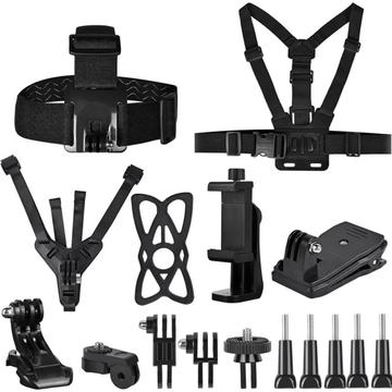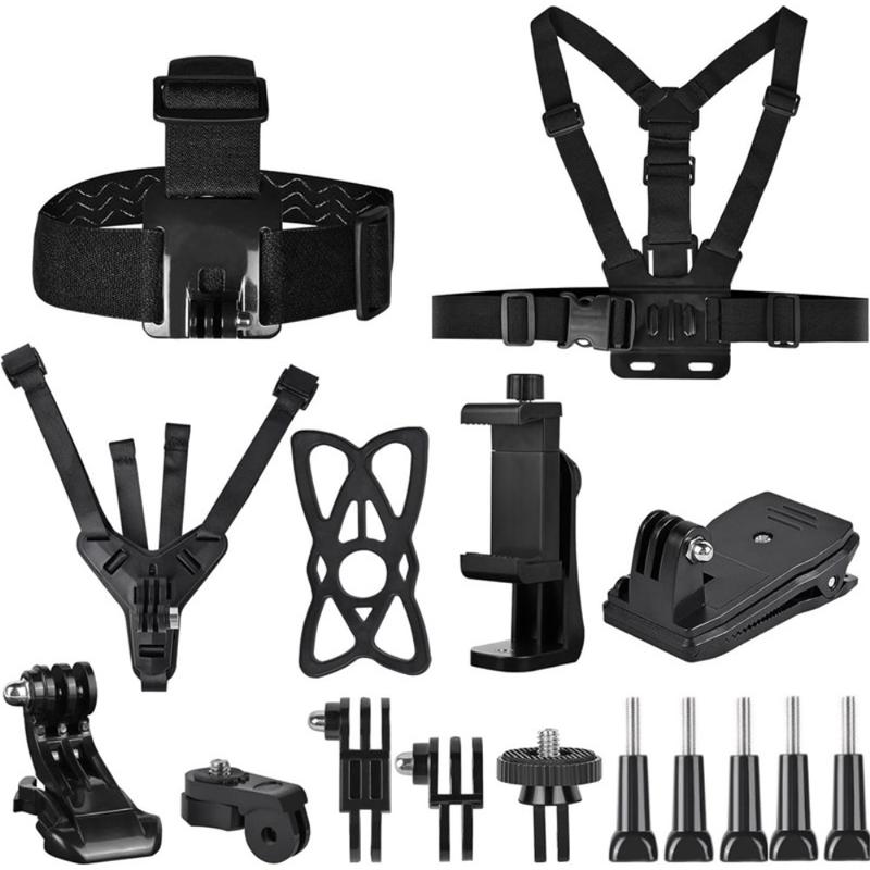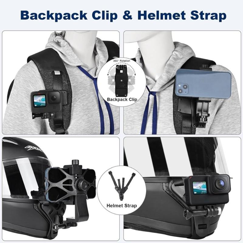 11-i-1-tillbehörssats för actionkamera för GoPro - huvudrem, bröstsele, hakfäste, ryggsäcksklämma och telefonhållarsats