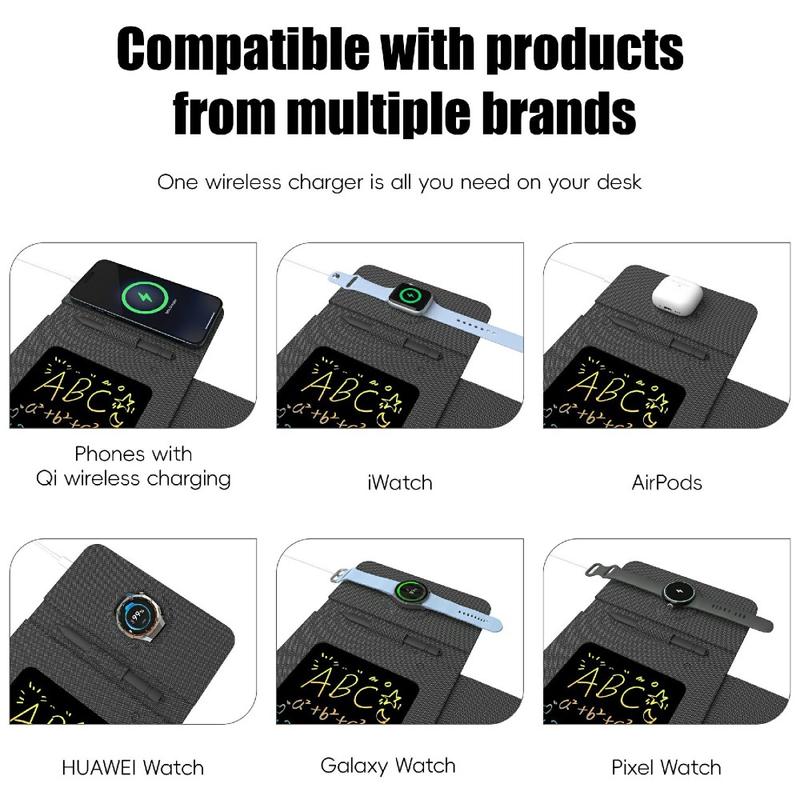 - 4-i-1-design: trådlös laddningsplatta, telefonstativ, musmatta och skrivtavla