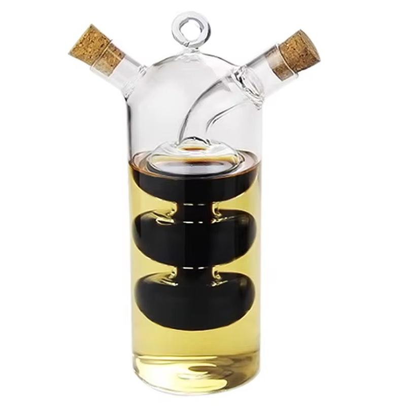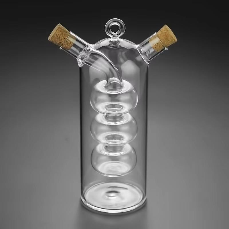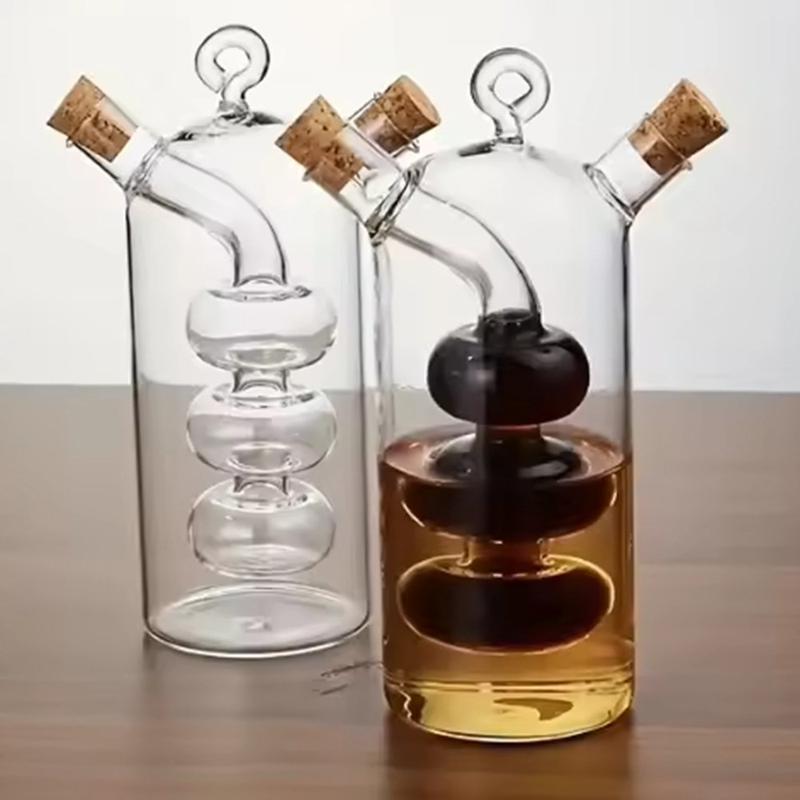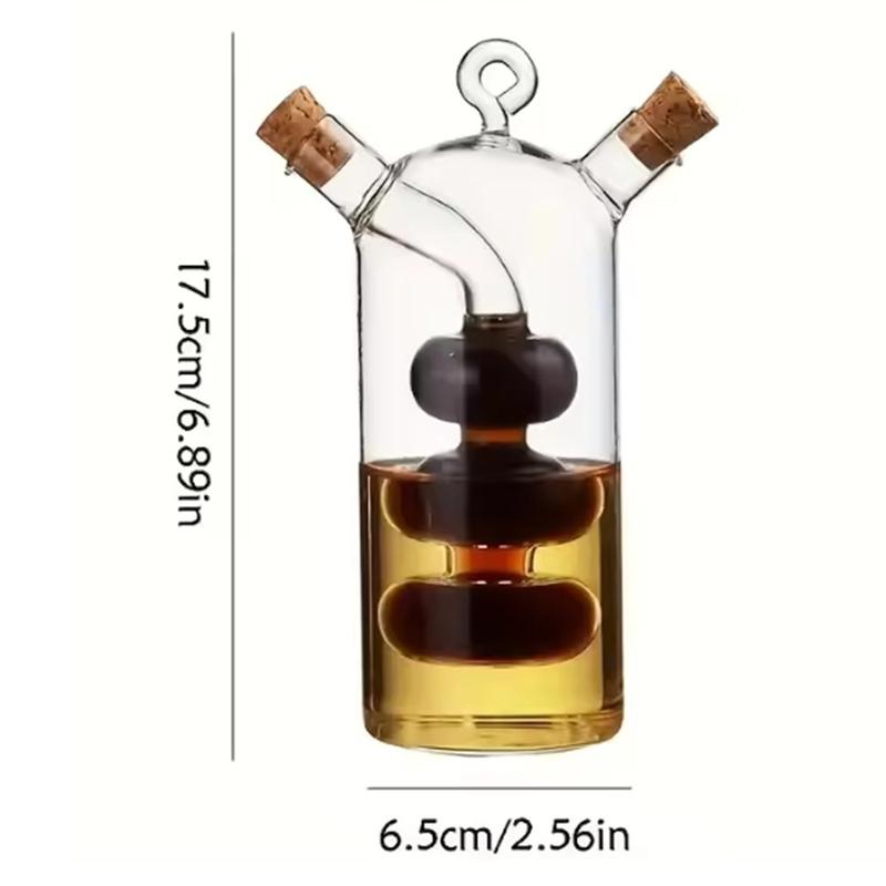 2-i-1 Dispenserflaska för olja och vinäger i glas - Borosilikatglas med dubbla kammare och korkpropp - 350ml/80ml kapacitet - BPA-fri