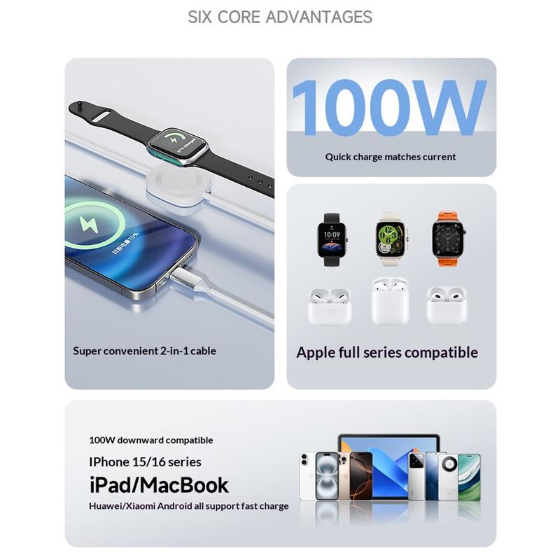 Denna 2-i-1-snabbladdningskabel eliminerar röran genom att kombinera en kraftfull 100W PD-kontakt med en magnetisk Apple Watch-laddare. Den starka magneten säkerställer perfekt, bekymmersfri inriktning, medan kopparkärnan förbättrar effektiviteten och skyddar enhetens batterier under snabbladdning. Den breda protokollkompatibiliteten gör den idealisk för användare med flera enheter - snabbhet, bekvämlighet och långsiktig tillförlitlighet i ett kompakt tillbehör.