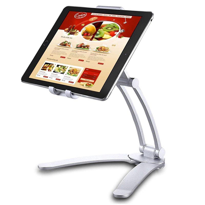 Se dina favorit YouTube-kanaler, serier, filmer, eller kvitton medan du lagar mat utan att smutsa ner din surfplatta, placera den bara på skrivbordet eller fäst den på väggen eller i köket. Det inkluderade häftande väggfästet kan också fixeras med två skruvar. Denna hållare för surfplattor har två ben som håller den stadigt på plats.