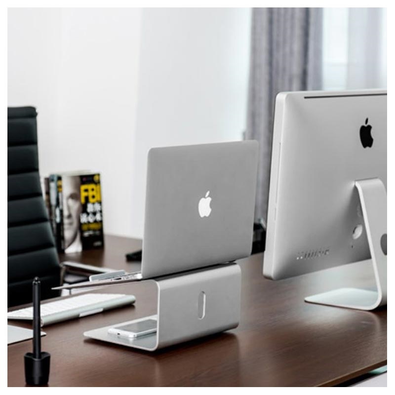 Dess praktiska design låter dig placera din laptop till en mer bekväm position och gör det perfekt för alla typer av kontor. Botten har en roterande platta som gör din arbetsdag mer flytande, medan de speciella gummidynorma förhindrar olyckliga tapp.