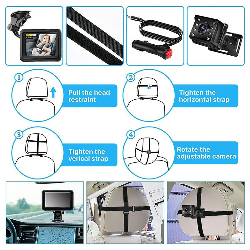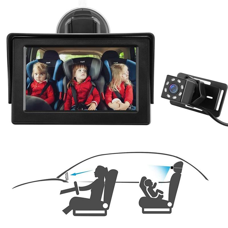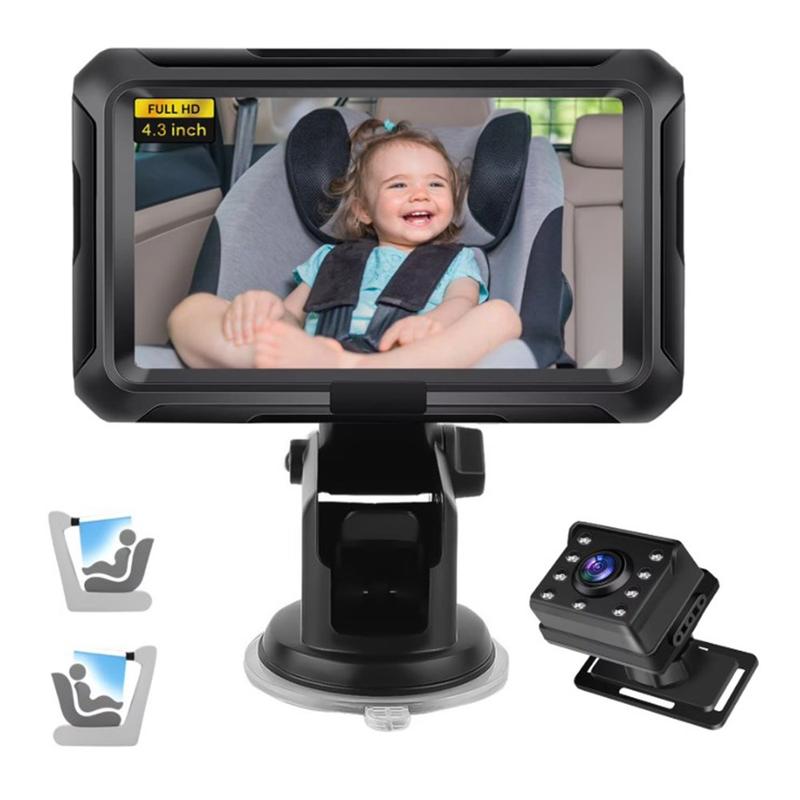 4,3-tums HD 1080P babyvakt för bil - vidvinkelkamera för mörkerseende med 360 graders rotation för säkerhet i baksätet