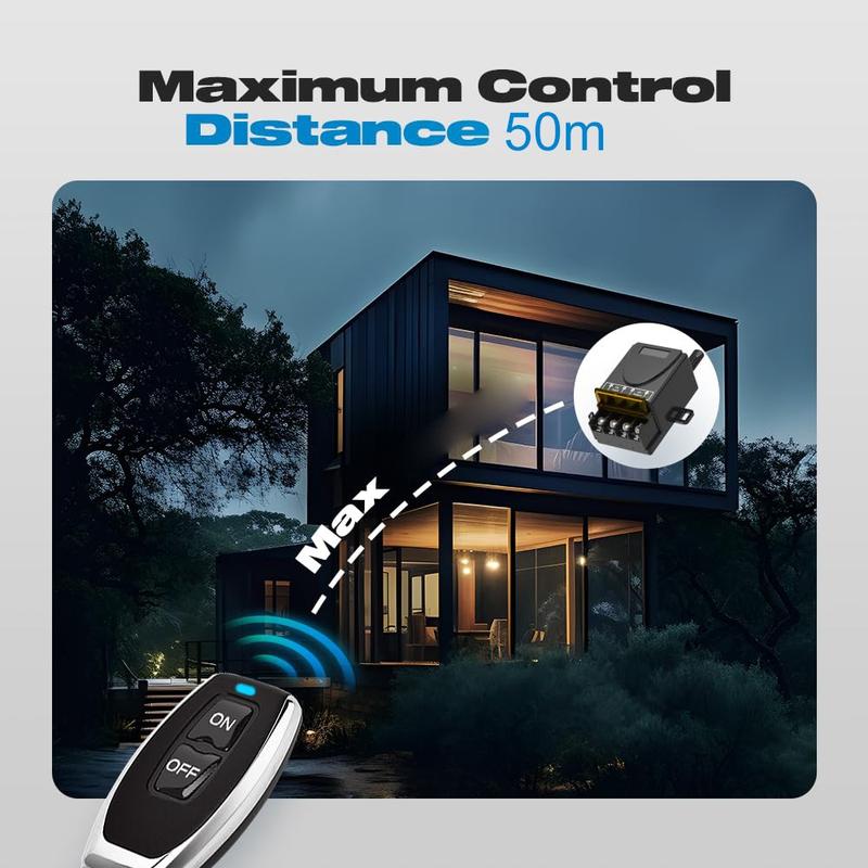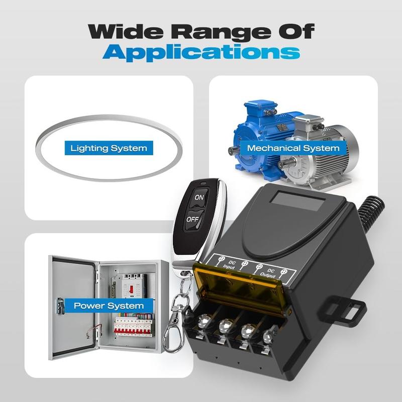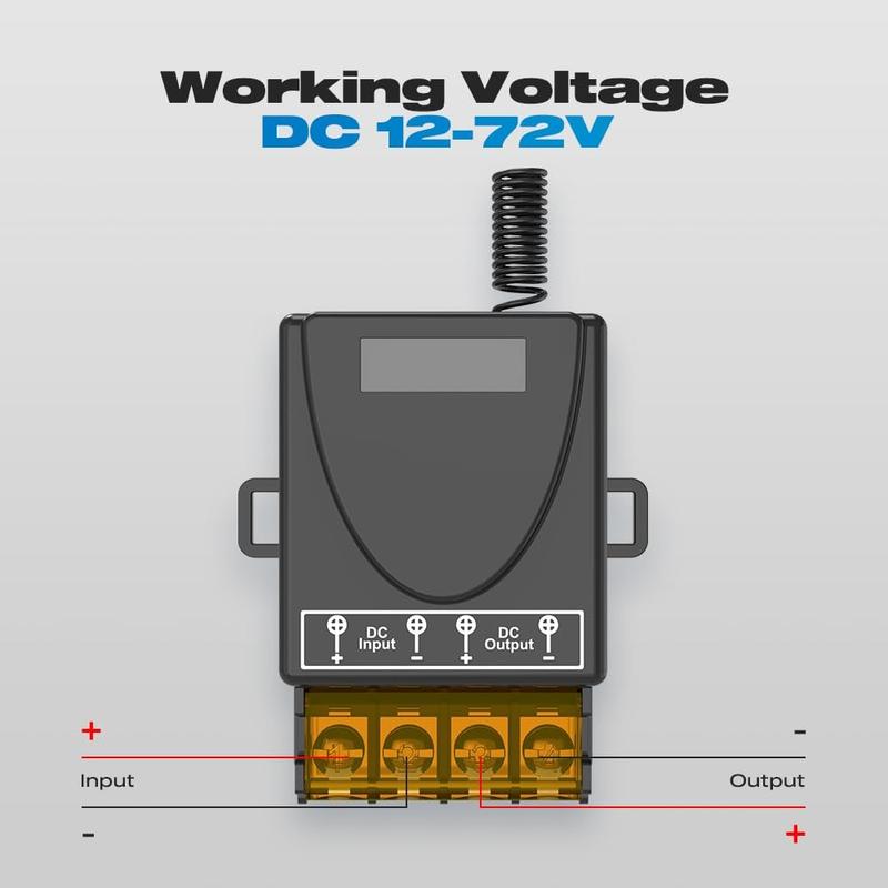 Styr dina DC-drivna enheter trådlöst med detta 433MHz RF-reläomkopplingskit, som är utformat för bekväm fjärrstyrning av på/av-funktioner i ett brett spektrum av applikationer. Det är lämpligt för 12V-72V-system och kan användas med LED-belysning, fläktar, motorer, pumpar och utvalda säkerhets- eller automatiseringsinstallationer. Den medföljande mottagaren och två fjärrkontroller ger dig flexibel drift för hemprojekt, verkstäder, garage, grindar och utrustningskontroll.