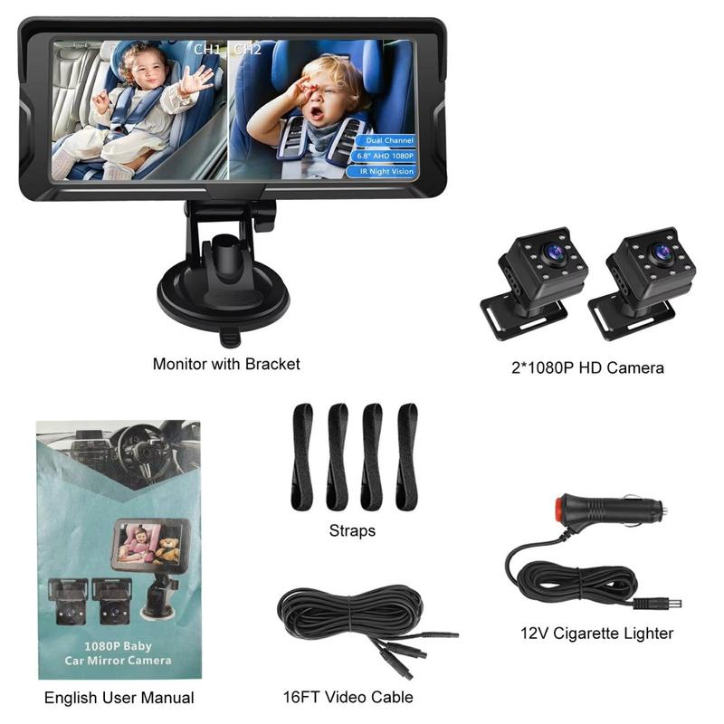 Få sinnesfrid och säkrare körning med 6,8-tums bilbarnvakt med dubbla kameror. Med två 1080P HD-kameror och en bred 6,8-tums skärm kan du övervaka två barn eller olika områden i baksätet samtidigt. Med 360° roterbara kameror, uppgraderat infrarött mörkerseende och ett brett 150° synfält ger det tillförlitlig täckning dag som natt. Den här babyvakten är enkel att installera och byggd med ett tåligt vattentätt hölje och är den perfekta säkerhetskompisen i bilen för familjer.