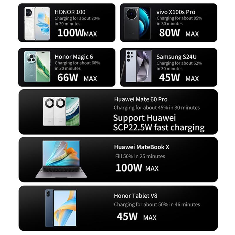 - Stöd för snabb laddning: PD3.1, QC3.0 och andra vanliga standarder
