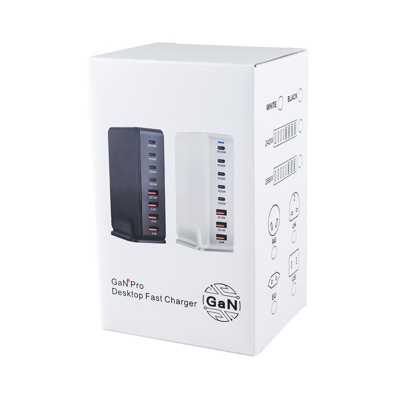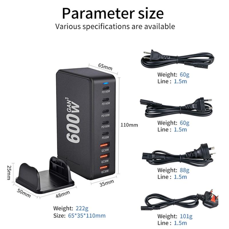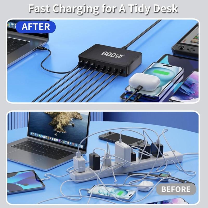 600W GaN-laddningsstation för skrivbord - 8 portar (5x USB-C + 3x USB-A) PD3.1 snabbladdare, upp till 140 W USB-C, intelligent strömfördelning