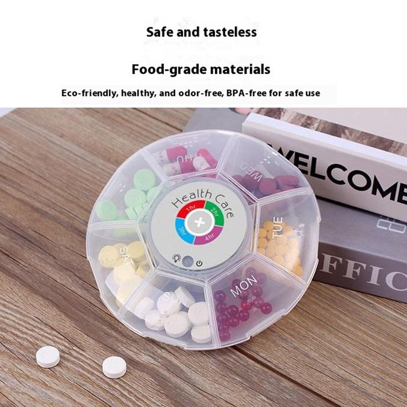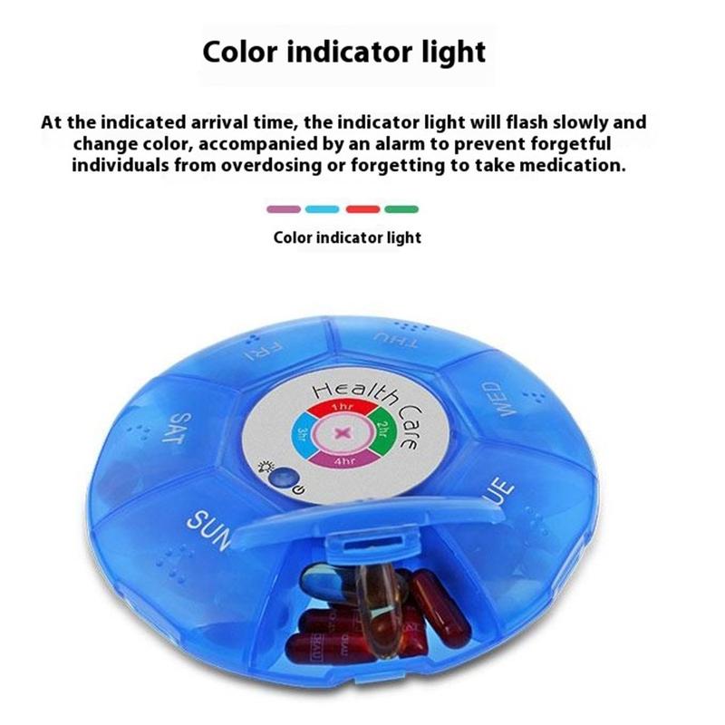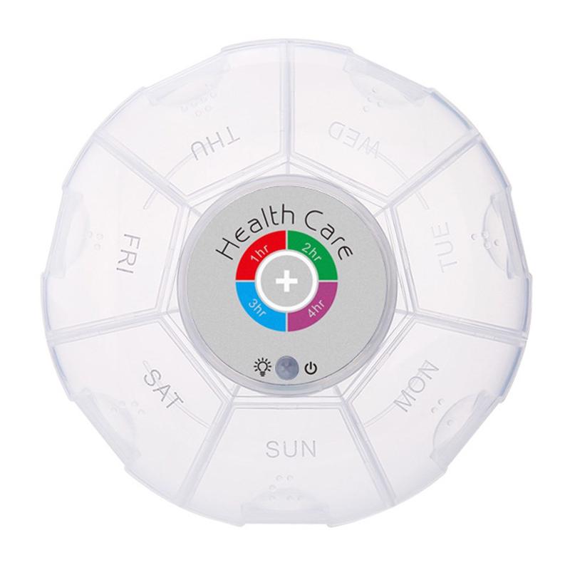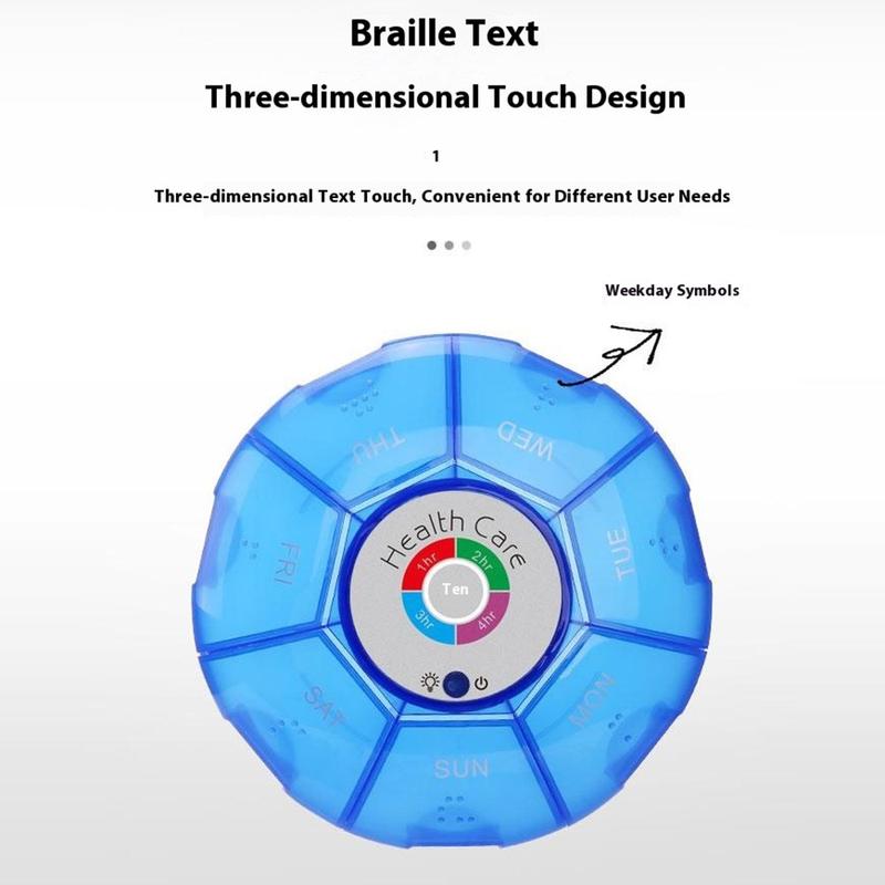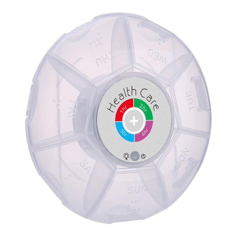 Håll koll på varje dos - även när du är på resande fot. Denna runda pillerburk med sju fack kombinerar färgskiftande LED-lampor med ljudsignaler, så att du kan programmera upp till fem påminnelser med 1-, 2-, 3- eller 4-timmars intervall. Brailleskrift och upphöjda veckodagssymboler gör layouten inkluderande, medan ett fuktsäkert, stöttåligt skal skyddar tabletter i handväskan eller handbagaget.