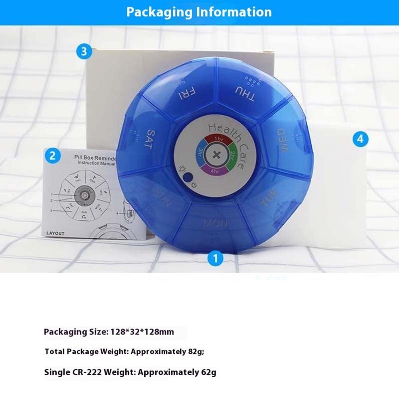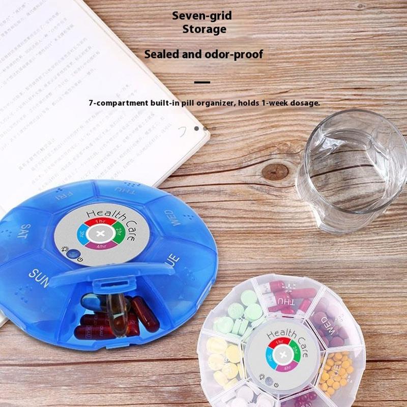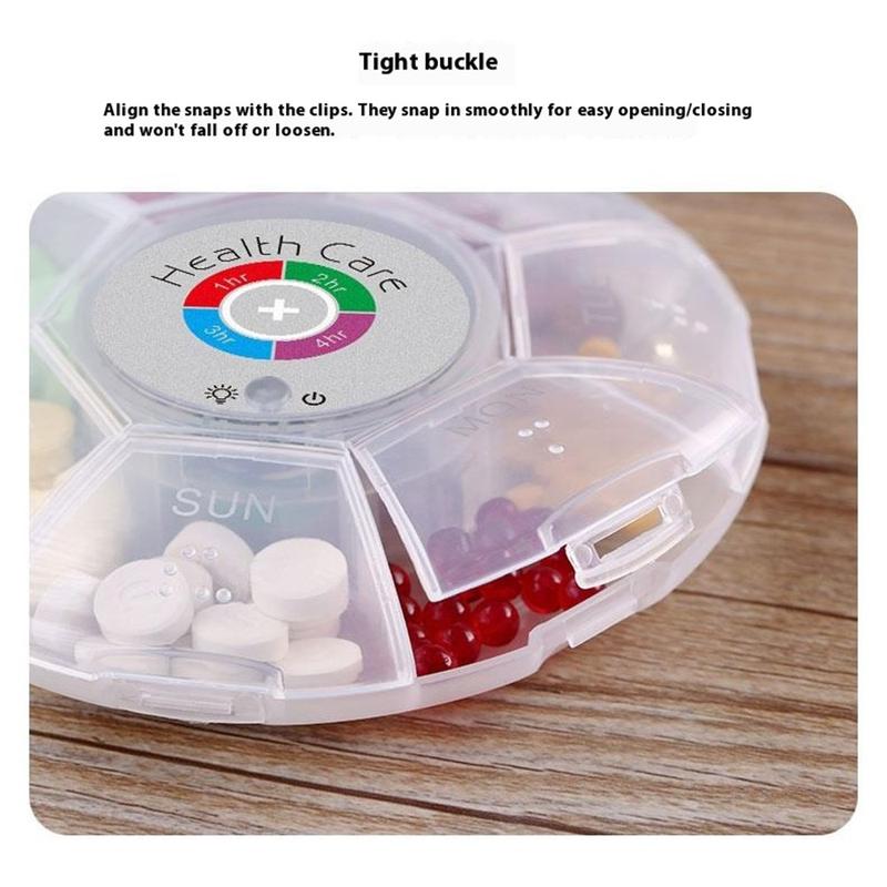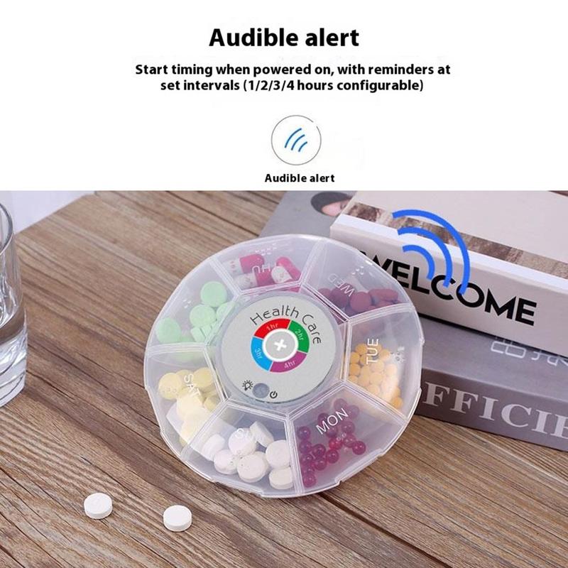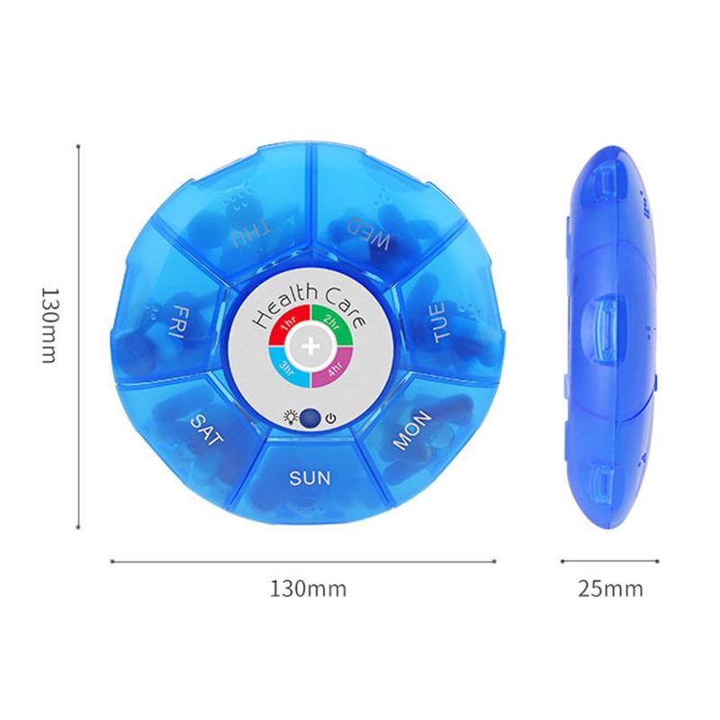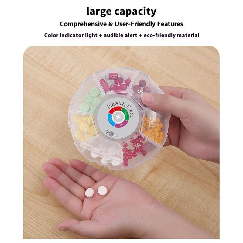 Håll koll på varje dos - även när du är på resande fot. Denna runda pillerburk med sju fack kombinerar färgskiftande LED-lampor med ljudsignaler, så att du kan programmera upp till fem påminnelser med 1-, 2-, 3- eller 4-timmars intervall. Brailleskrift och upphöjda veckodagssymboler gör layouten inkluderande, medan ett fuktsäkert, stöttåligt skal skyddar tabletter i handväskan eller handbagaget.