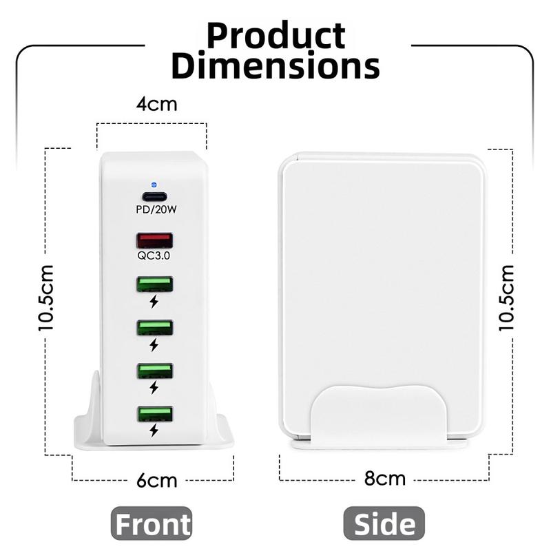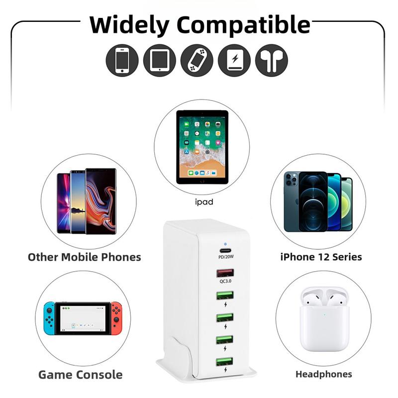 Med en PD-port, en QC3.0-port och ytterligare fyra USB-A-utgångar kan du ladda flera enheter samtidigt - perfekt för arbetsstationer, familjer eller resenärer som bär med sig flera prylar.
