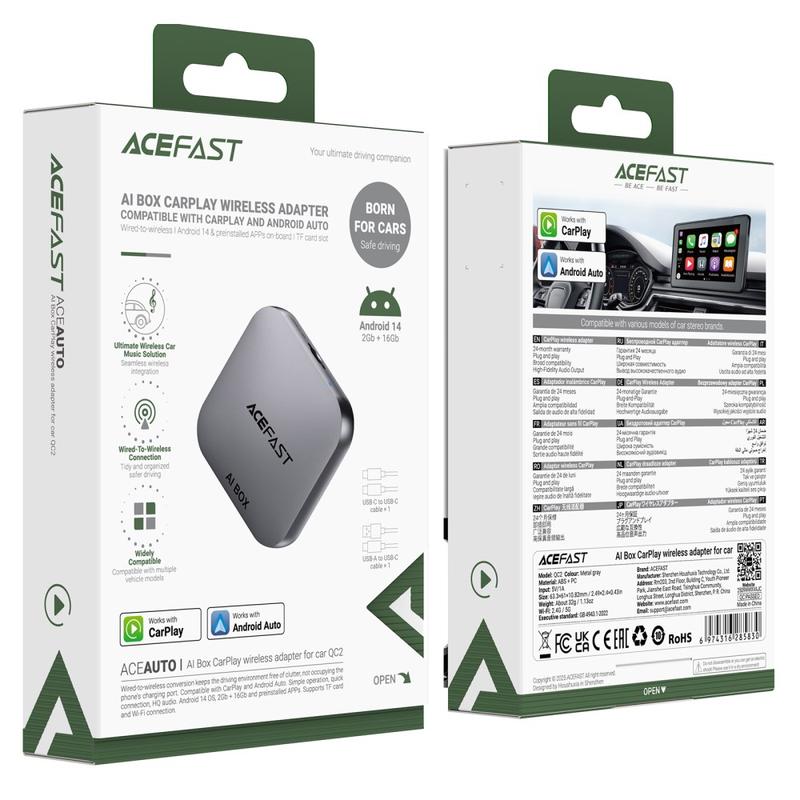 ACEFAST QC2 AI Box uppgraderar omedelbart ditt fordon genom att omvandla traditionell kabelansluten CarPlay eller Android Auto till ett helt trådlöst system. Den är utformad för en smidigare och roligare körupplevelse och stöder både iPhone- och Android-enheter, vilket ger snabb anslutning, sömlös kontroll och friheten att komma åt underhållningsappar direkt på din bildskärm. Med en kompakt, lätt konstruktion och inbyggd expanderbar lagring ger den bekvämlighet och funktionalitet på nästa nivå till alla kompatibla fordon.