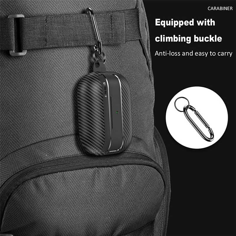 Det stötabsorberande materialet med kolfiberstruktur ger ett väsentligt skydd mot fall och stötar till dina hörlurar och dess laddningsfodral, samtidigt som det ger en ny cool look. Detta skal till AirPods Pro 3 kommer med en praktisk karbinhake för säkrare bärning.