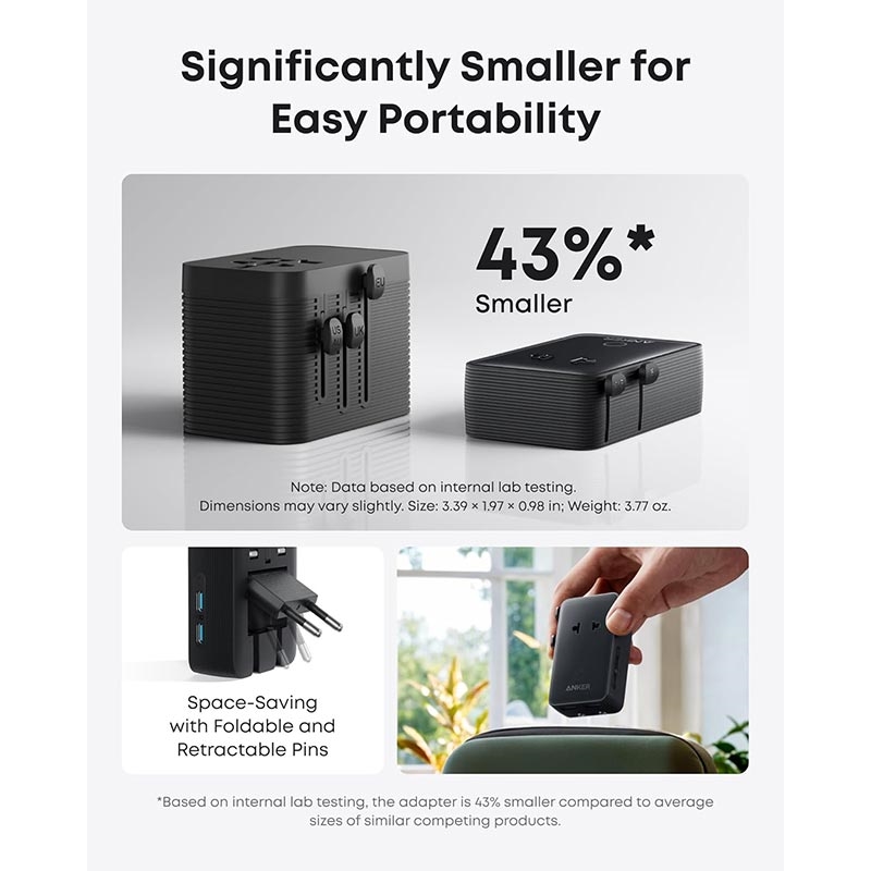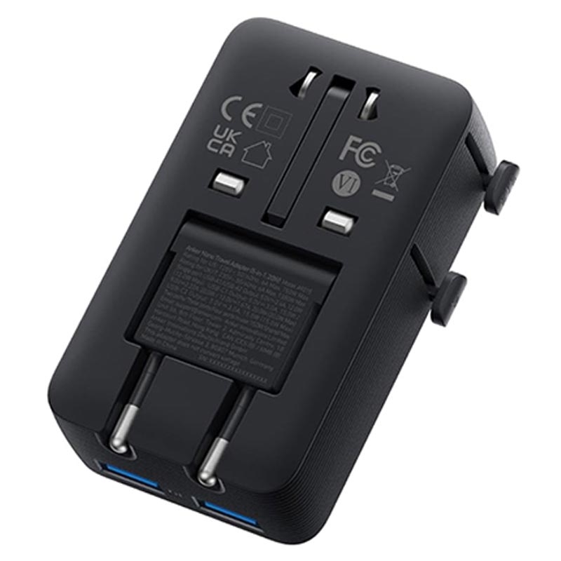 Anker Nano Travel Adapter är den perfekta kompakta strömlösningen för globala resenärer. Den är utformad för att fungera i över 200 länder och har fyra universella kontakttyper - typ A, typ I, typ G och typ C - vilket garanterar sömlös kompatibilitet vart du än går. Med totalt fem portar, inklusive två USB-C- och två USB-A-utgångar samt ett universellt AC-uttag, kan du ladda flera enheter samtidigt, även under snabba resor.