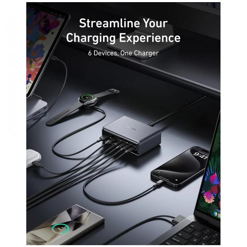 En kompakt hubb som ger ström till en hel arbetsstation. Fyra USB-C- och två USB-A-portar delar på hela 200 W, så att du kan ladda två 14-tums bärbara datorer, en telefon, öronsnäckor och en powerbank från ett enda vägguttag.