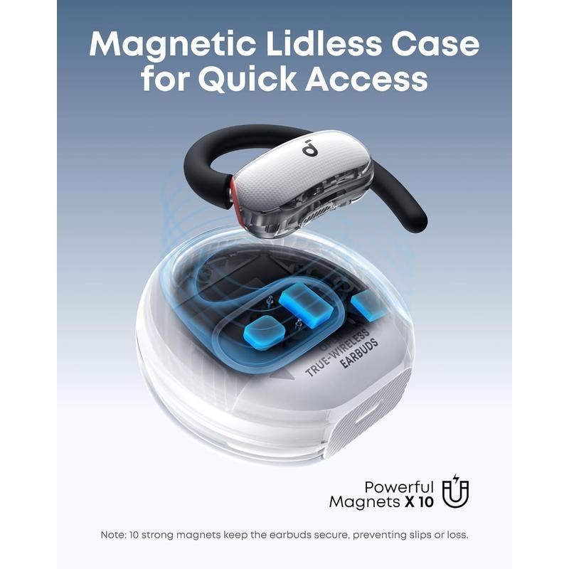 Soundcore V40i är perfekt för dig som vill ha komfort utan att kompromissa med medvetenhet eller ljudkvalitet. De justerbara öronkrokarna ger en stabil, personlig passform, medan de kraftfulla elementen ger en slagkraftig bas som är ovanlig i öppna öron. Kombinerat med tydliga AI-förbättrade samtal, vattentålighet och ett unikt lockfritt fodral är det ett smart val för både vardagsanvändning och en aktiv livsstil.