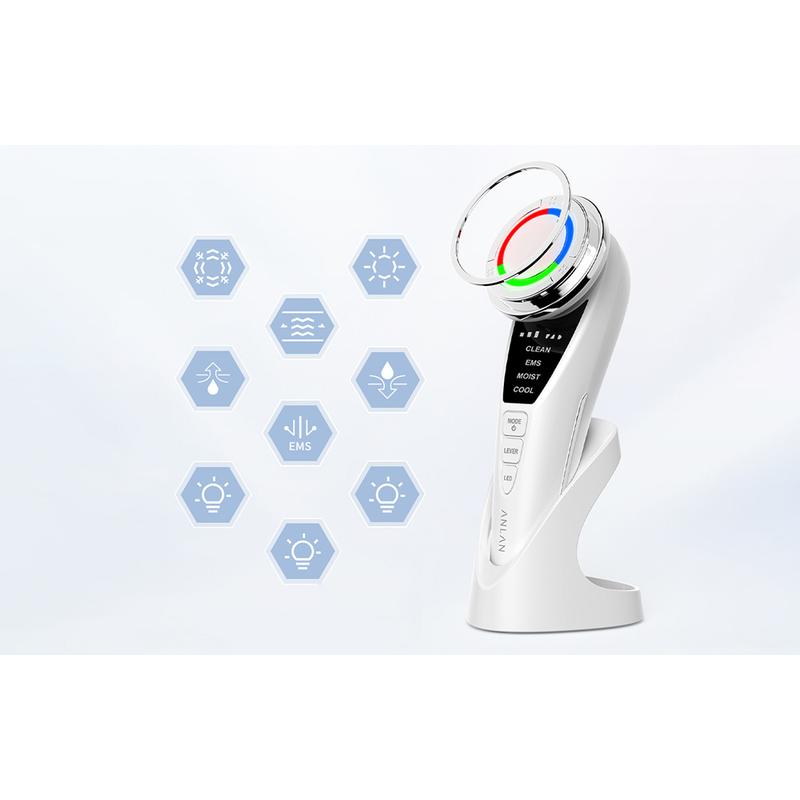 ANLANs ultraljudsmassageapparat för ansiktet har så många funktioner att den ersätter så många som 5 olika hudvårdsapparater. Du kan använda produkten för att utföra fototerapi, djuprengöra huden, göra kompresser eller till och med slimma ansiktet. Och detta är fortfarande inte alla funktioner som enheten har! Arbetssättet med joner och högfrekventa vibrationer säkerställer att näringsämnena i de hudvårdsprodukter som används når de djupaste hudlagren, så att du kan njuta av en felfri hy. Kom ihåg att tvätta bort sminket noggrant innan du använder massageapparaten.