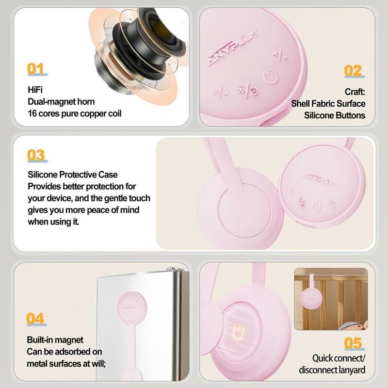 - 24 lugnande ljud: Inkluderar 6 vita ljud, 4 babyljud, 4 sömnmusikspår och 10 naturljud som regn, åska, havsvågor och mer, vilket hjälper användare att snabbt falla i djup sömn.