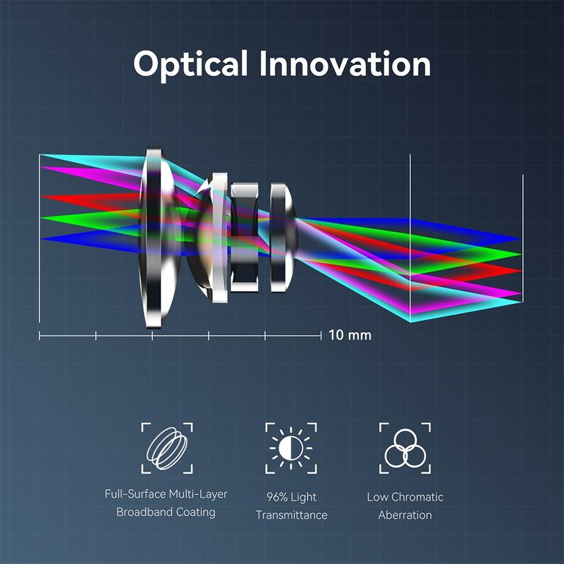 - Avancerad optisk teknik - Bredbandig optisk beläggning i flera lager med 96% ljustransmittans minimerar distorsion och kromatisk aberration för tydliga, färgriktiga bilder.