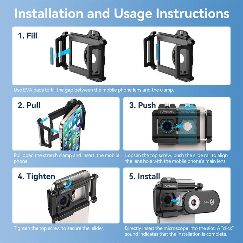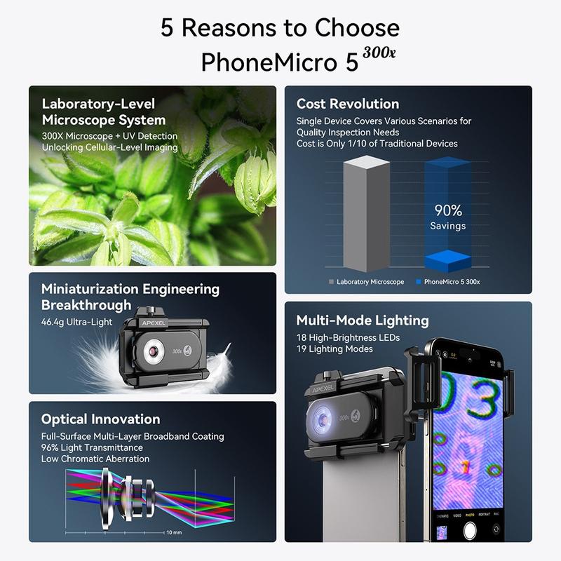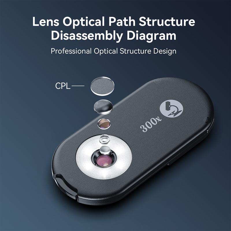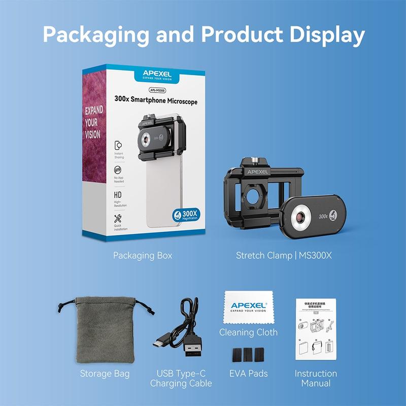 Förvandla din smartphone till ett kraftfullt bärbart mikroskop med APEXEL APL-MS300 300X clip-on mikroskoplins. Detta kompakta tillbehör är utformat med optik av professionell kvalitet och avancerade belysningssystem och ger förstoring på laboratorienivå direkt till din telefon - perfekt för vetenskapsentusiaster, lärare, juvelerare och tekniker.