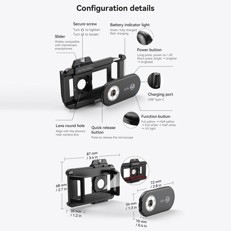 Mikroskoplinsen APEXEL APL-MS300 ger förstoring och belysning på professionell nivå i ett verktyg i fickformat. Dess precisionsoptik, trefärgade LED-belysning och UV-detektering gör det till ett oumbärligt tillbehör för utforskning, forskning och kreativ fotografering.