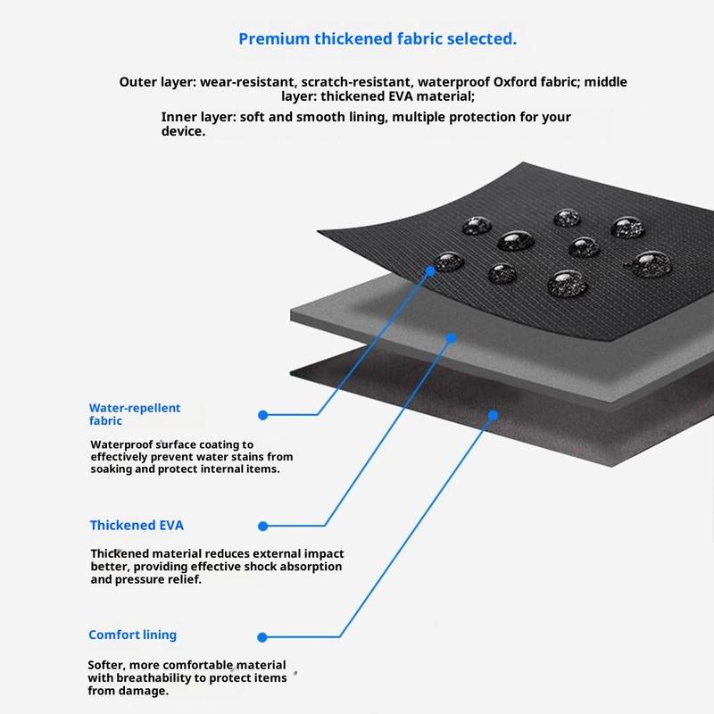 - Slitstark flerskiktskonstruktion - Tillverkad av vattentätt Oxford-tyg, EVA och polyester, vilket ger överlägset skydd mot droppar, damm och fukt.