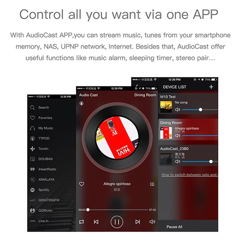 Audiocast M5 använder WiFi istället för Bluetooth och ger stabil och högkvalitativ ljudstreaming i hela hemmet. WPS-anslutningen med en knapptryckning gör installationen snabb och enkel, så att du slipper komplicerad nätverkskonfiguration.