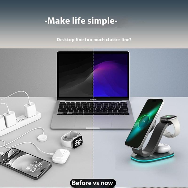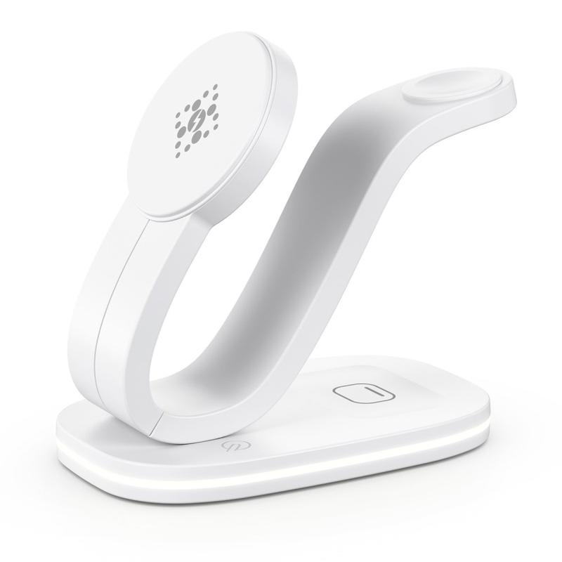 Få bort röran på skrivbordet med ett enda stativ som ger snabb trådlös laddning på 15 W, laddar din smartklocka med 2 W, matar dina öronsnäckor med 3 W och fungerar som en skonsam nattlampa.