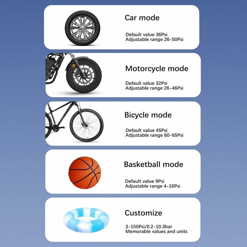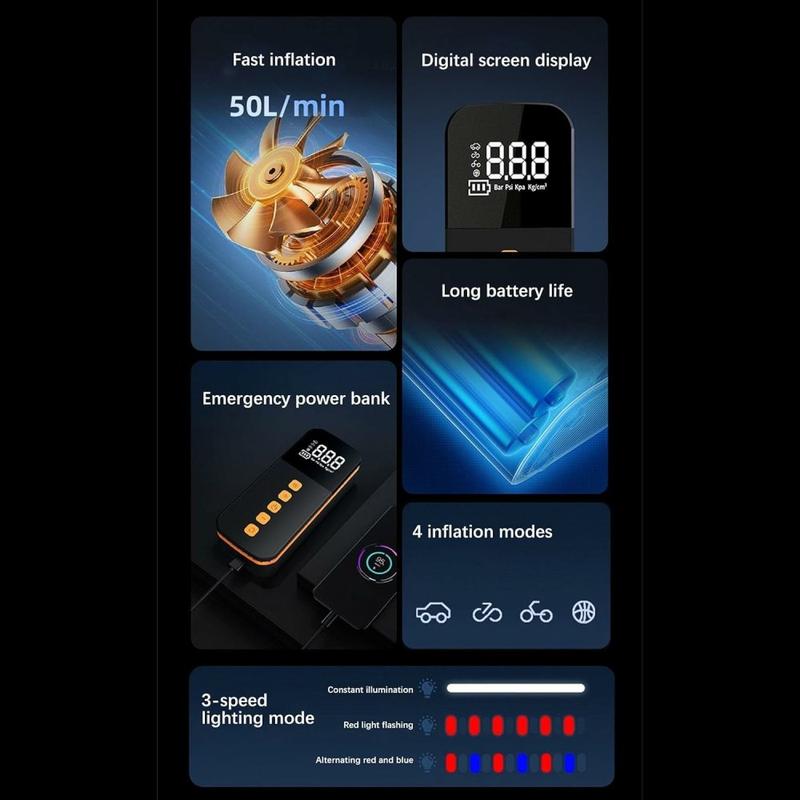 Till skillnad från skrymmande traditionella luftkompressorer är den här trådlösa digitala uppblåsaren lätt, bärbar och enkel att använda. Den smarta displayen, de förinställda lägena och den kraftfulla uppblåsningshastigheten gör den till en praktisk följeslagare för säker körning och en aktiv livsstil.