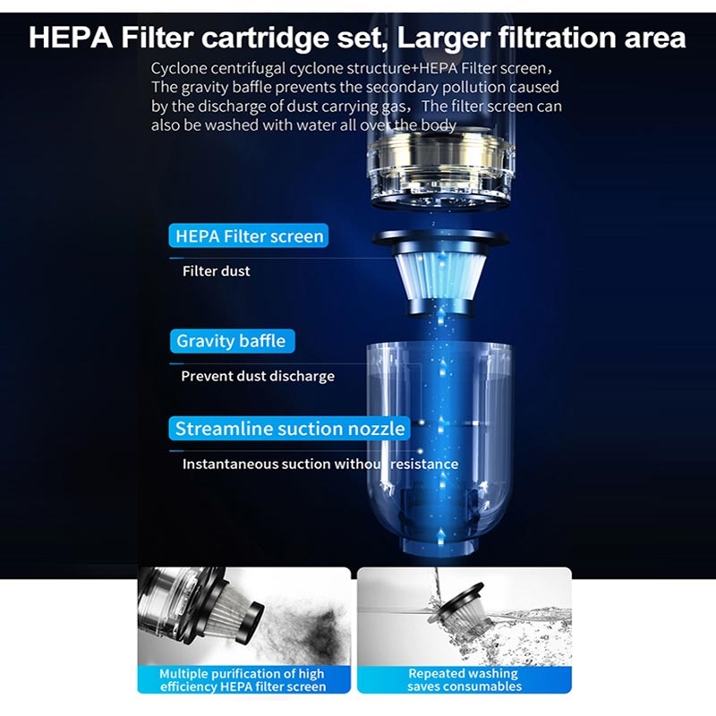 Denna handhållna dammsugare erbjuder den perfekta mixen av bärbarhet och rengöringskraft. Dess sladdlösa design, starka sugförmåga och LED-belysning gör den lämplig för både snabb rengöring och djupgående rengöring, oavsett om du är hemma, på kontoret eller på resande fot.