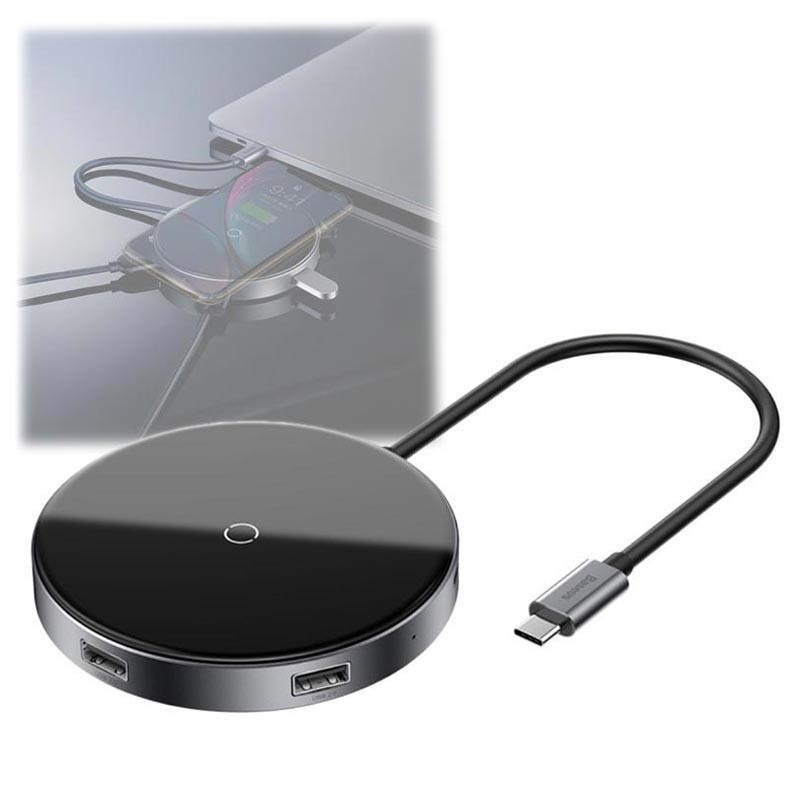 Baseus Circular Mirror 6-i-1 Qi Trådlös Laddare och Hub med Typ-C PD, 4 USB Portar - 10W, 60W, 5Gbps, 480Mbps