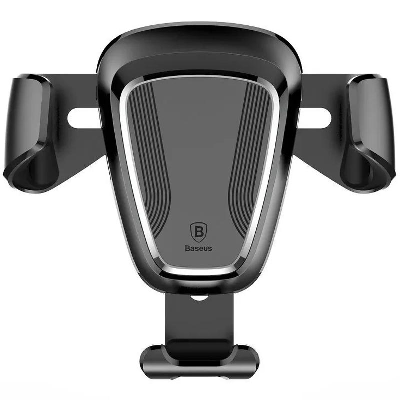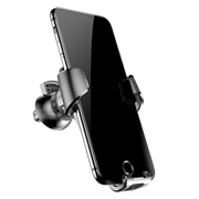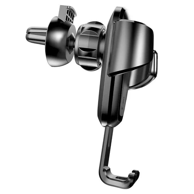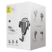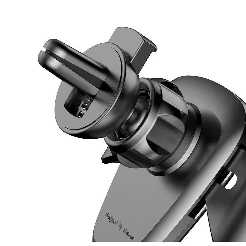 Gravitational Baseus telefonhållare, monterad på bilens ventilationsgaller. Hållarens justeringsområde är 360 grader. Utformad för telefoner från 63 till 88 cm breda. Hållarens automatiska sidoklämmor anpassar sig automatiskt till telefonens bredd. Det utskurna spåret gör att du kan ansluta laddaren.