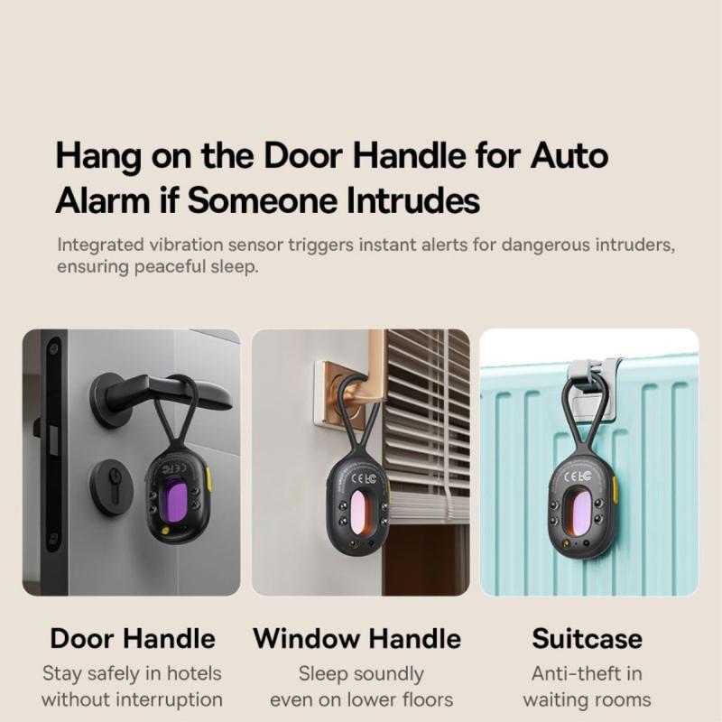 - Häng på dörrhandtaget för automatiskt larm: Inkluderar en inbyggd vibrationssensor som omedelbart varnar dig för eventuella inkräktare, vilket garanterar en fridfull vila.