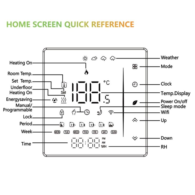 Denna termostat har en elegant ramlös frontpanel med en 3,0-tums LCD-skärm och en 2,5D-böjd kant för ett raffinerat, modernt utseende. Den flerfärgade LED-skärmen gör det enkelt att se inställningar och rumsinformation med ett ögonkast, medan de dolda kapacitiva pekknapparna bidrar till att bevara den minimalistiska designen. Den smälter snyggt in i väggen och passar både moderna och klassiska interiörer.
