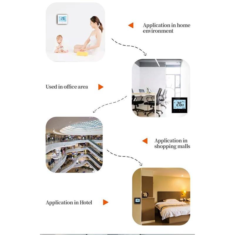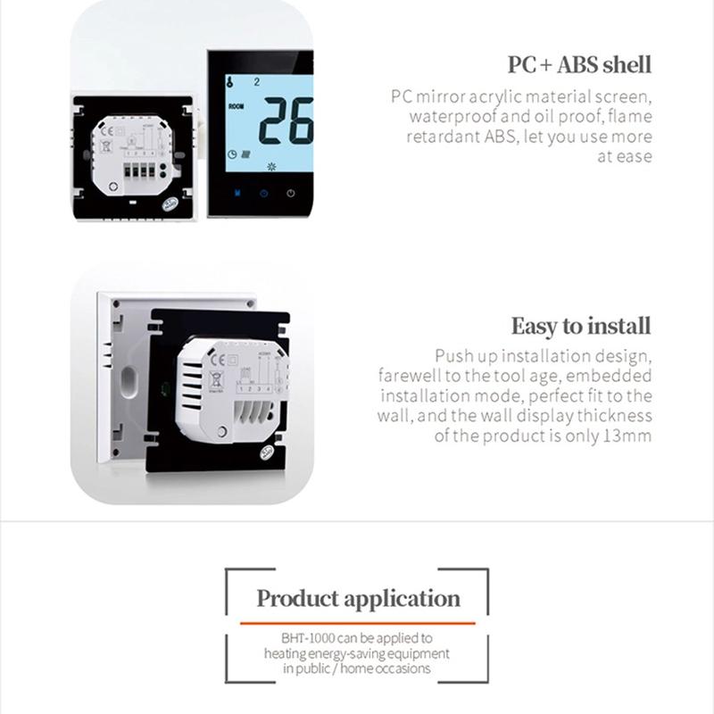 Den smarta termostaten BHT-1000GB är utformad för att ge en precis och stabil styrning av elektriska golvvärmesystem i bostäder, hotell, lägenheter och andra inomhusmiljöer. Tack vare den exakta temperaturregleringen och det praktiska pekgränssnittet bidrar den till en behagligare inomhusmiljö samtidigt som den dagliga användningen förblir enkel. Den moderna paneldesignen gör den till ett snyggt och funktionellt tillskott i en mängd olika inredningsmiljöer.