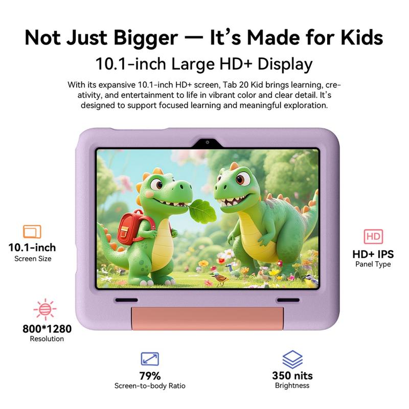 Tab 20 Kids är byggd speciellt för barn och erbjuder ett enkelt, intuitivt gränssnitt, stark hållbarhet, dubbla högtalare för en behaglig upplevelse och kontroller på systemnivå som hjälper föräldrar att hantera användning och innehåll.