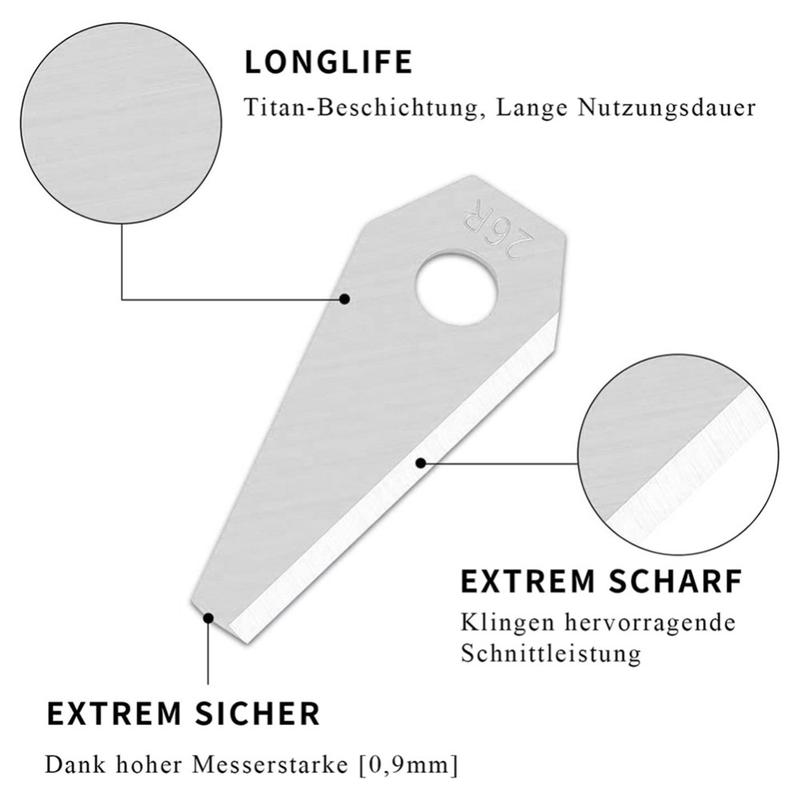 Högkvalitativt material: Tillverkade av högkvalitativt rostfritt stål med en extra titankarbidbeläggning, dessa gräsrobotblad är slitstarka och hållbara, vilket garanterar optimal prestanda för din gräsrobot