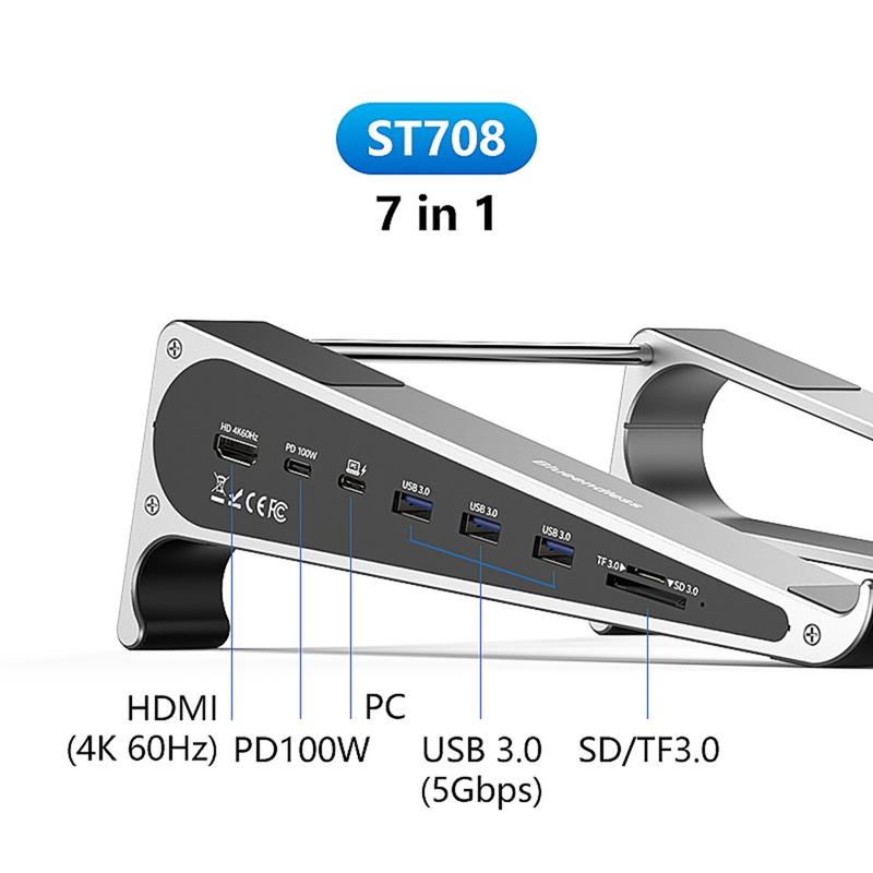 Blueendless ST708 7-i-1-laptopstativ med USB-hubb - 4K@60Hz HDMI, 100 W PD-laddning, 3xUSB 3.0, TF-kortläsare, laptopstativ i aluminium