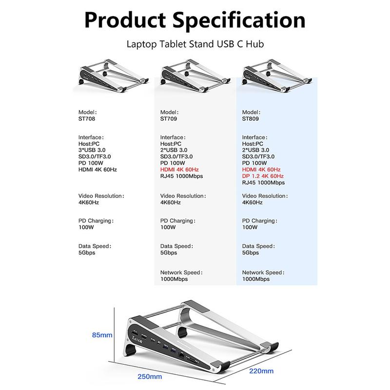 Med stöd för 4K@60Hz-videoutgång och 100W Power Delivery-genomströmningsladdning håller ST708 din bärbara dator laddad samtidigt som du utökar din skärm till en extern bildskärm. Strukturen i aluminiumlegering med stödrör i rostfritt stål ger stabilitet och hållbarhet, vilket gör den lämplig för hemmakontor, kreativa arbetsstationer och resor.