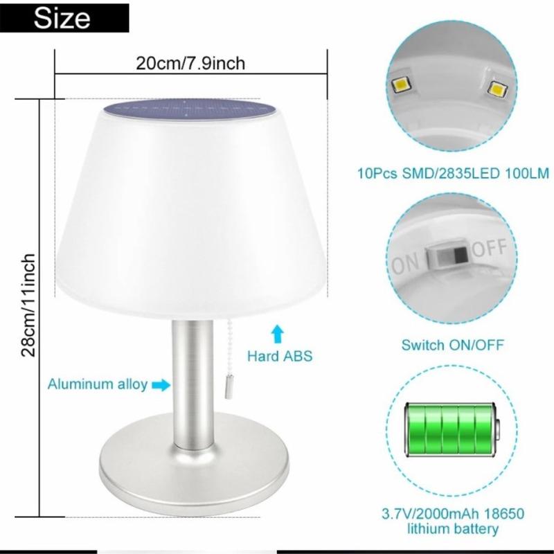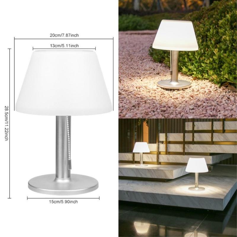 Njut av mysig, bländfri belysning inomhus eller utomhus med denna soldrivna bordslampa. Tio ögonvänliga lysdioder sitter inuti en ram i borstat rostfritt stål och en frostad kupa, medan en integrerad polykristallin panel laddar litiumbatteriet på 1200 mAh under dagen. När skymningen faller tänds lampan automatiskt och har två ljusstyrkelägen (mjuk eller stark) för upp till 8 timmars behaglig belysning eller 4 timmars fokuserad läsning - inga kablar, inga elräkningar, bara bärbart ljus där du behöver det.